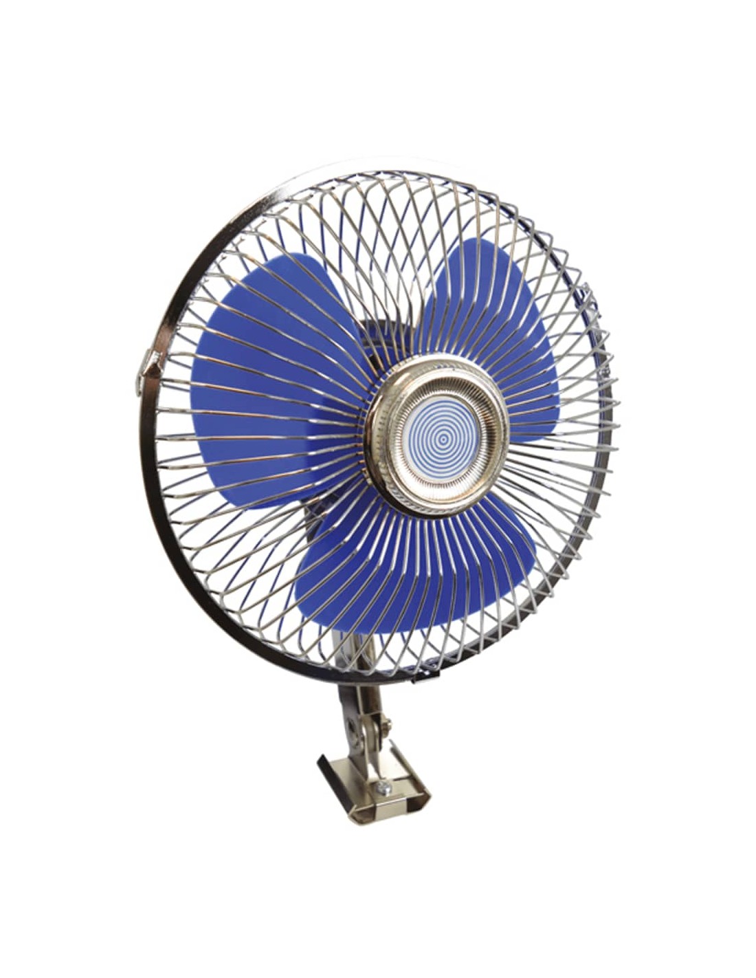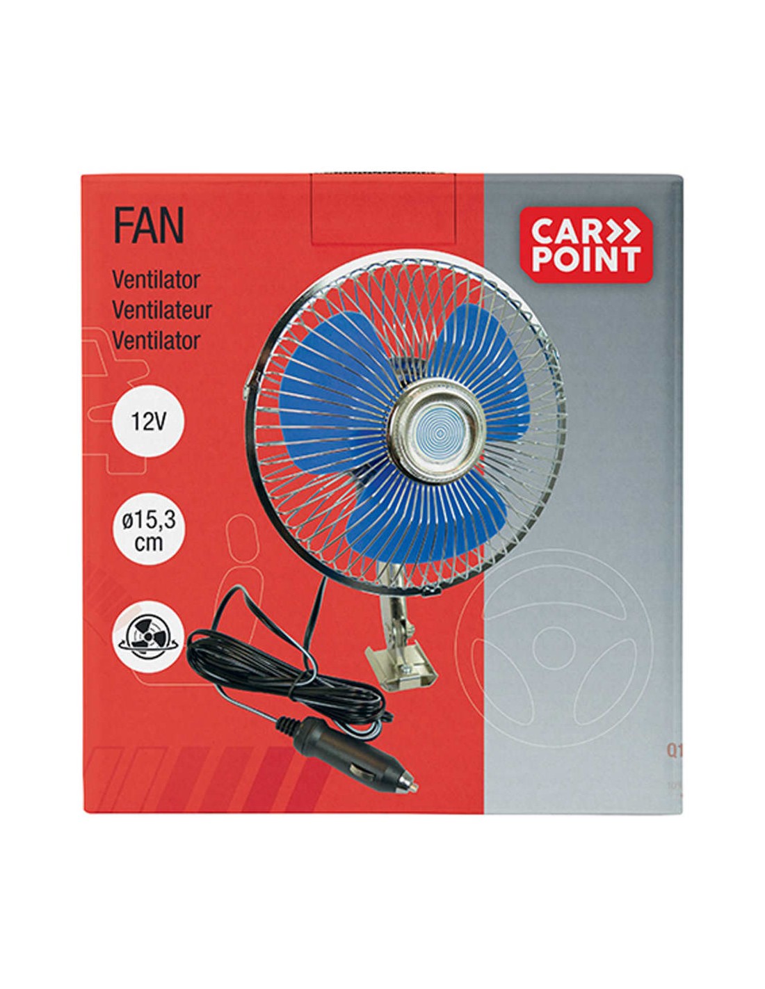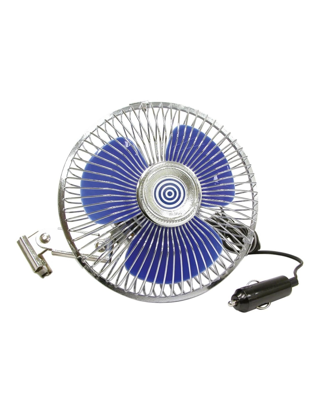 L'elettroventilatore ha una potenza massima di 21 watt. La ventola in metallo oscilla e può essere fissata all'interno con due viti incluse. La ventola funziona a 12 V ed è alimentata da un accendisigari.