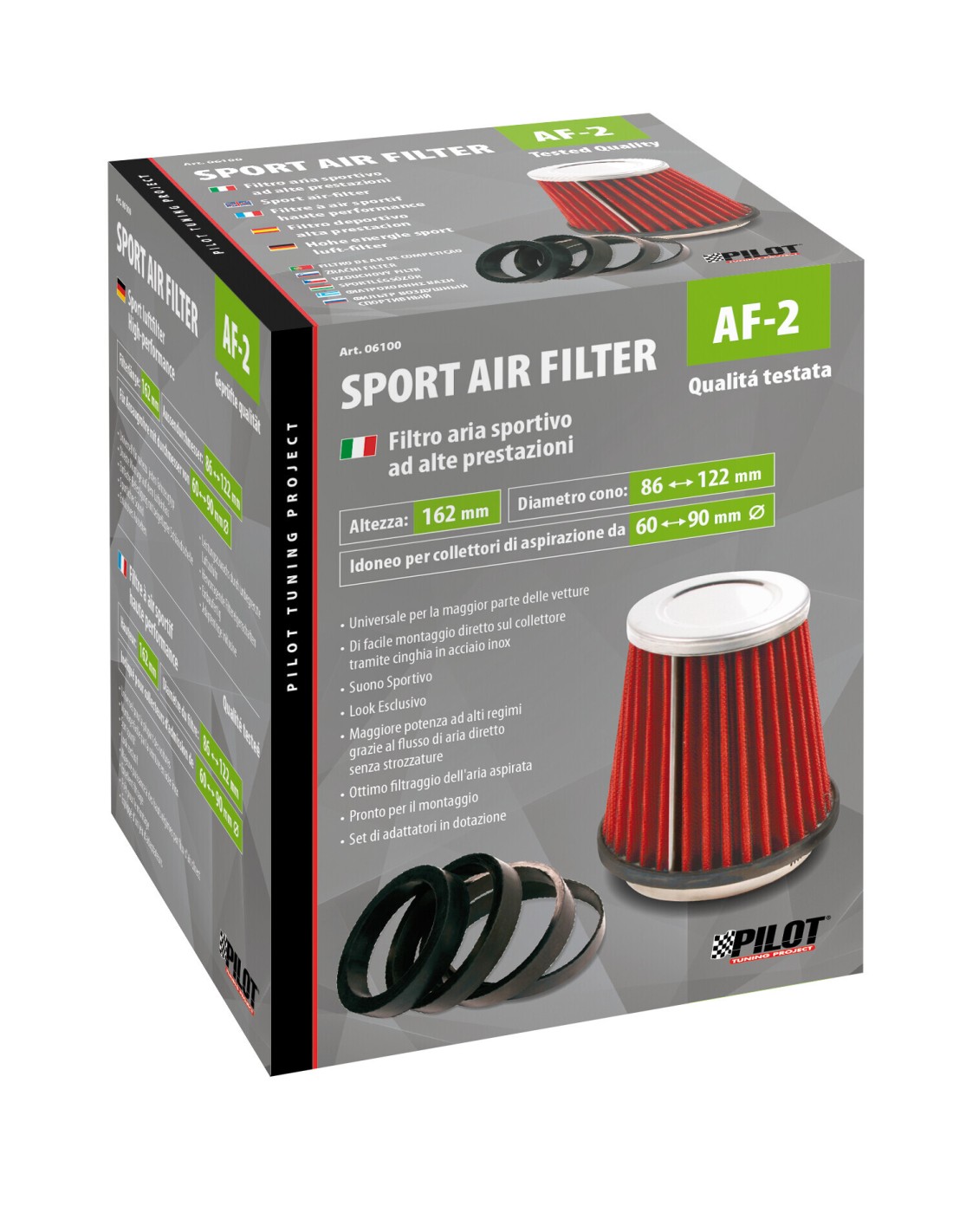 Universali per la maggior parte delle vetture.Montaggio diretto sul collettore tramite fascetta in acciaio inox e set di adattatori. Suono sportivo e look esclusivo. Maggiore potenza ad alti regimi grazie al flusso d’aria diretto senza strozzature. Ottimo filtraggio dell’aria aspirata. 2 anni di garanzia.