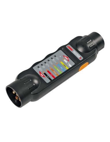 Controlla il funzionamento del sistema di illuminazione dei rimorchi (luci di direzione, luci posteriori, luci freno, luci retronebbia).Con adattatori per prese e spinotti 7/13 poli.Progettato in base allo standard ISO.Conforme alle normative Reach e Rohs.Funzionamento a pila 1x 9V (non inclusa)