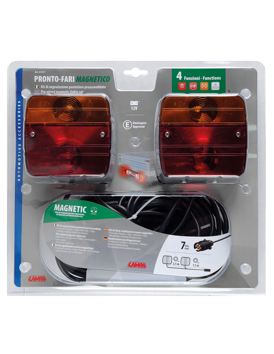 Omologazione Europea. Con base magnetica per un fissaggio rapido e universale su qualsiasi superficie metallica.Kit cablato e montato pronto per l’utilizzo, composto da:- 2 fanali posteriori magnetici a 4 funzioni: posizione, stop, direzione, targa- 2,5 m cavo di collegamento tra i due fanali - 7,5 m di cablaggio - Spinotto 7 poli- Lampadine incluse (1x): P21W, P21/5W