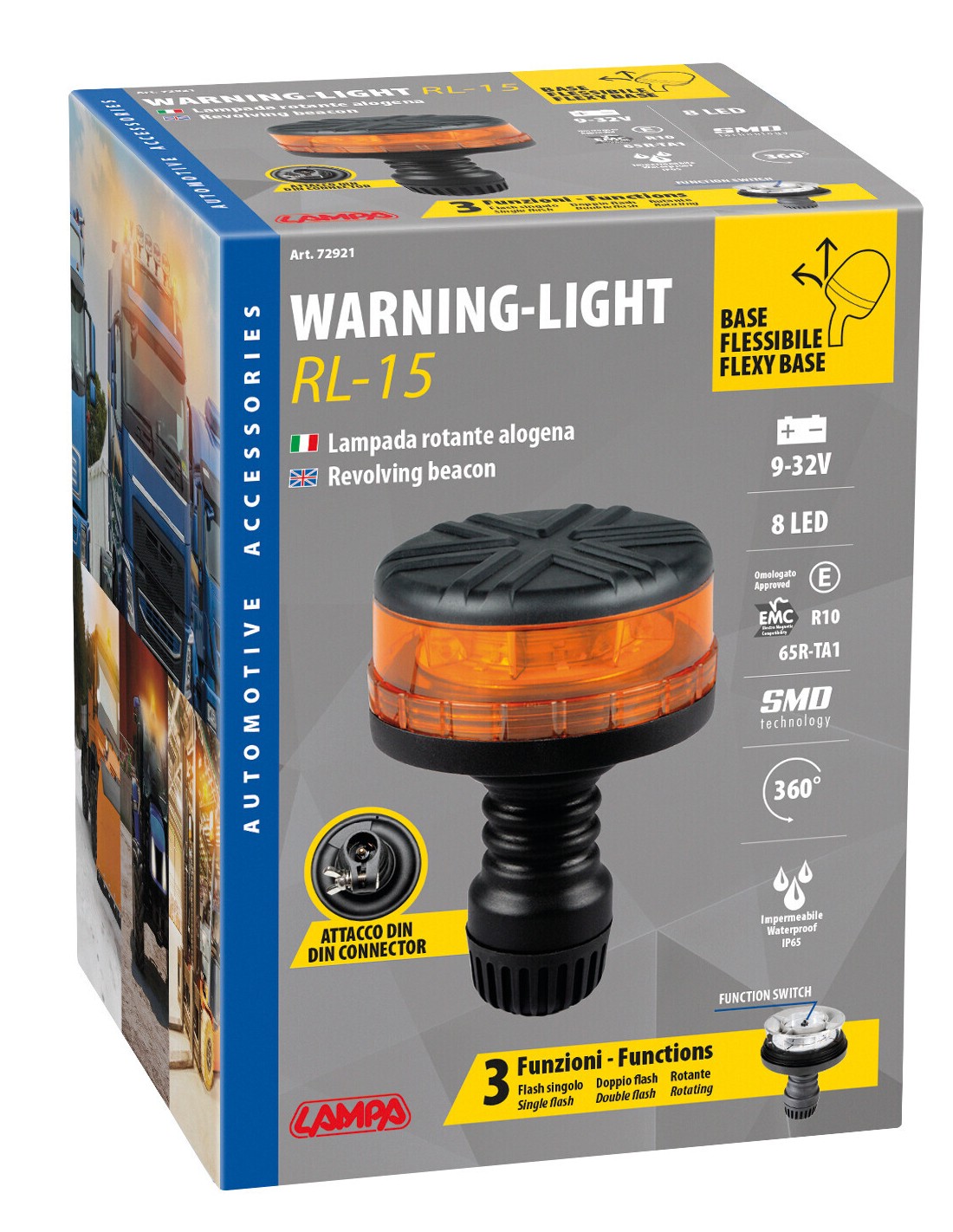 • 8 Led. Lente in policarbonato.• Luce a 3 funzioni: rotante, strobo e lampeggiante.• Attacco tubolare flessibile in gomma con innesto DIN.• 8 differenti basi di fissaggio disponibili (da ordinarsi separatamente).• Silenziosa, senza nessuna parte in movimento.• Impermeabile IP66.• Per veicoli industriali, mezzi agricoli, di emergenza, di soccorso.