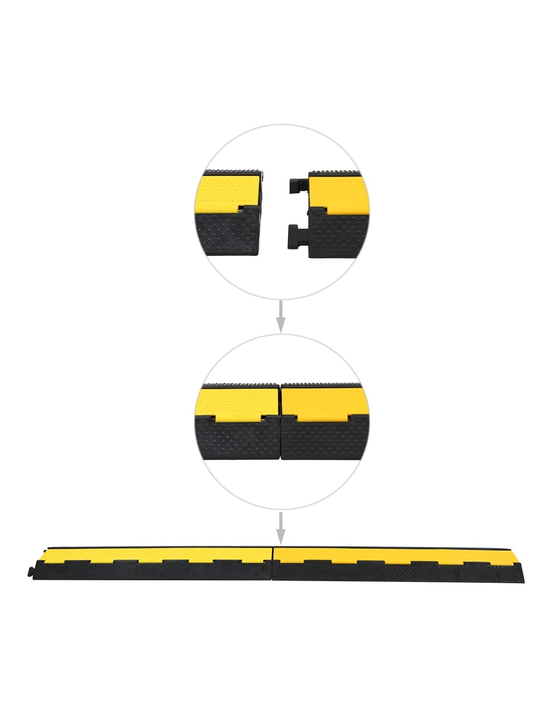 Il dosso è realizzato in gomma leggera, resistente e durevole. È inoltre colorato in giallo brillante e ha simboli di avvertimento sulla superficie che lo rendono più visibile. Il dosso ha due canali per guidare e proteggere i cavi e può supportare un peso massimo di 5 tonnellate. I cavi possono essere facilmente posizionati o rimossi ruotando verso l'alto la copertura superiore. Grazie al design modulare, è possibile collegare più dossi per adattarsi a cavi di maggiori lunghezze.