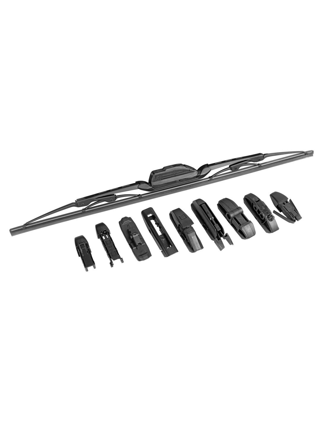 Sistema di montaggio multiplo, fino a 9 raccordi in dotazione:1 raccordo per il montaggio su tutte le vetture equipaggiate con tergicristalli tradizionali.8 raccordi speciali B+C+D+F+G+H+L+M per il montaggio su tutte le vetture all’origine con spazzole senza articolazioni• Design avanzato ed aerodinamico • Struttura in acciaio con verniciatura in polvere epossidica• Perfetta aderenza per una pulizia efficace• Lamina in gomma speciale con trattamento in Grafite per minimizzare l’attrito a contatto con il cristallo